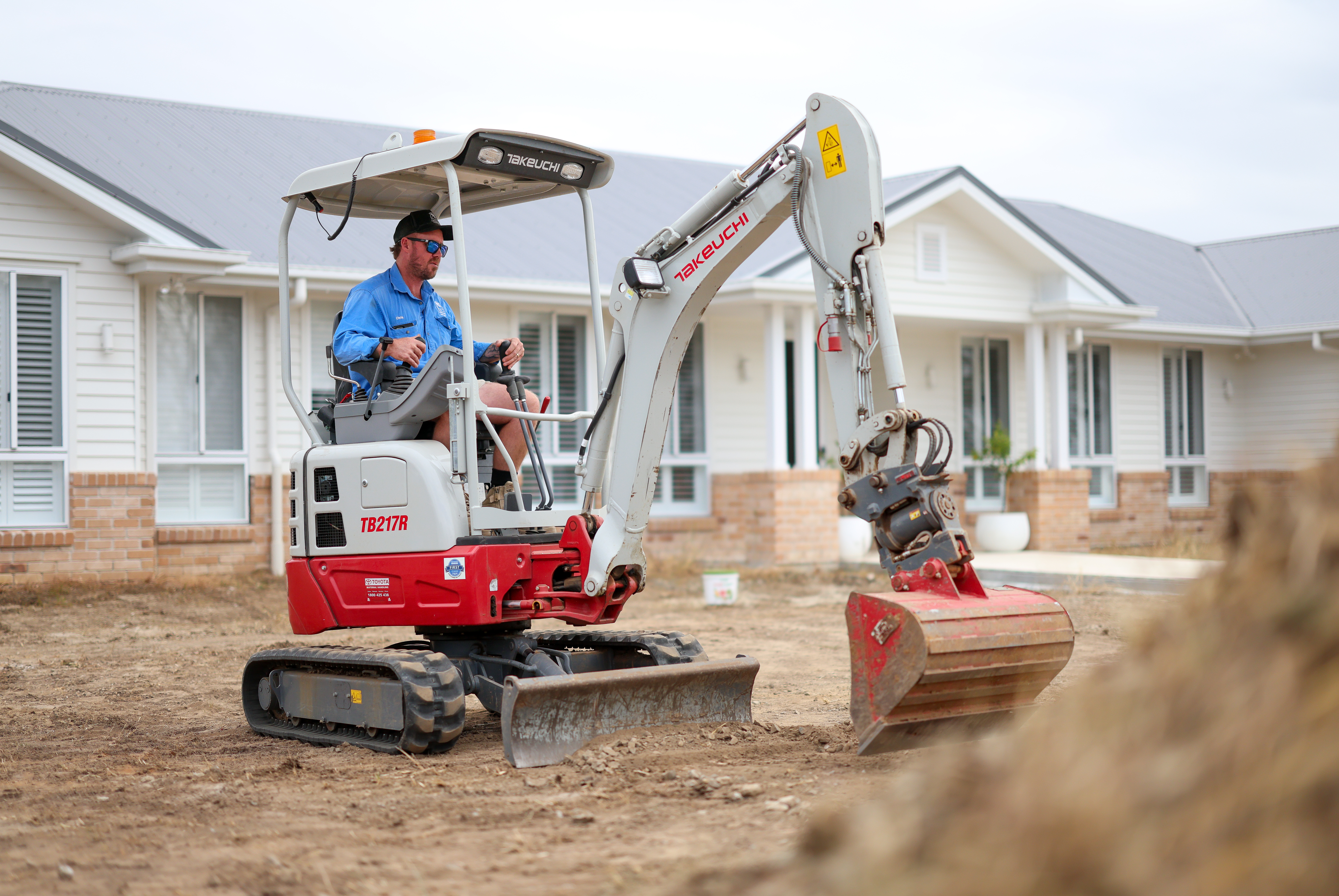 The Takeuchi is used primarily for short-term hire purposes by other businesses and tradespeople, clearing and levelling earth to make room for storage tanks, tiling and landscaping.